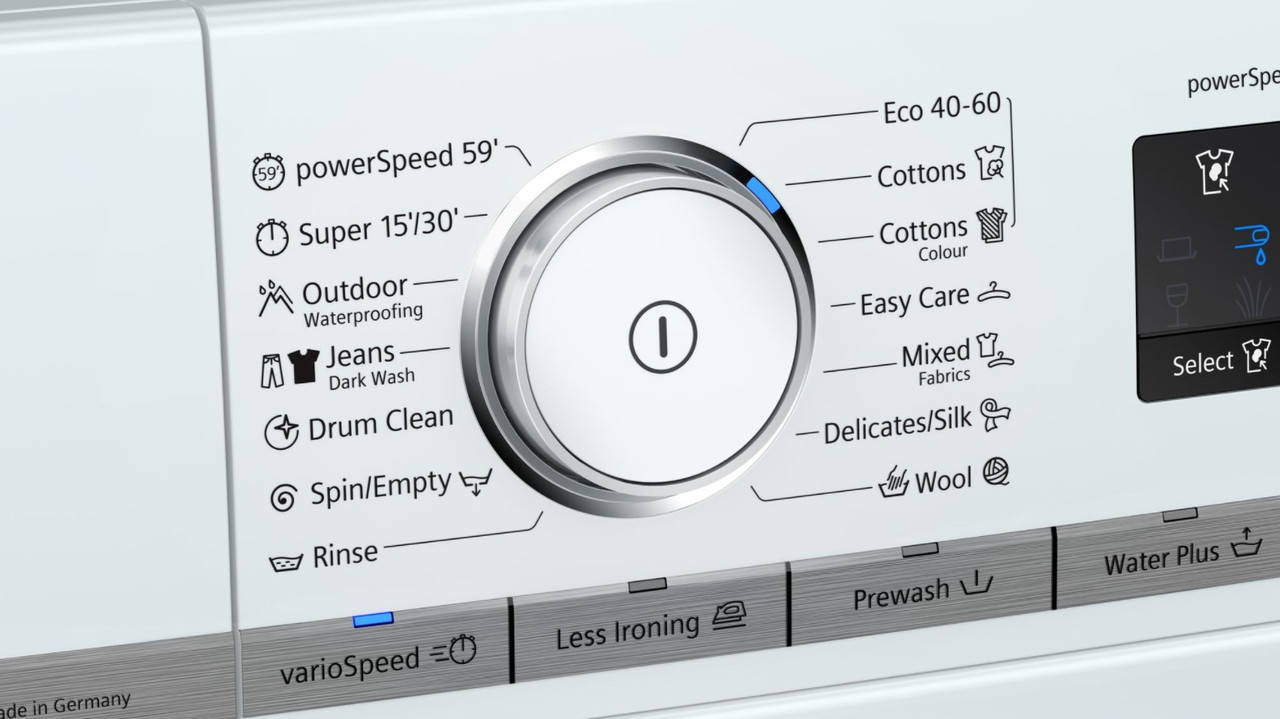 Кнопки touchControl: менше прасування (Less Ironing), вмикання/вимикання, затримка закінчення, вибір плям, дистанційний запуск, запуск/пауза з функцією дозавантаження білизни, вибір температури, varioSpeed, попереднє прання, plus, вибір віджиму/ затримка полоскання