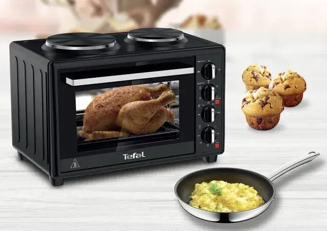 Настільна плита з духовкою Tefal Optimate OF463830 випускається в сучасному дизайні в суворому і практичному чорному кольорі. Модель потужністю 1,5 кВт містить дві електричні конфорки з нагрівальними елементами у вигляді опухних млинів та духовки об'єму 32 літра. Духова шафа закривається двостекальним дверцем, а внутрішня поверхня вкрита високопрозорою і термостійкою емалью, яка легко відмивається від залишків їжі. У духовці є 750 Вт, вертел і вентилятор, який створює повітряні потоки для рівномірного прогрівання продуктів з усіх боків. Вона функціонує в 5 режимах і здатна виконувати нагрівання до 230C, а точний час роботи можна задати таймером на 60 хвилин. Вправляє насольна плита з духовкою Tefal Optimate OF463830 чотирма поворотними регуляторами, розміщеними вертикально на фронтальній панелі.